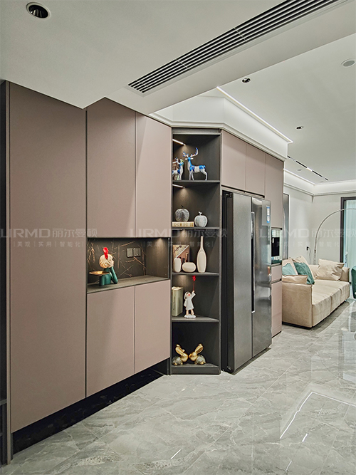 做了一個開放格的轉角裝飾柜來過渡嵌入式冰箱柜,整體美觀大氣又實用。