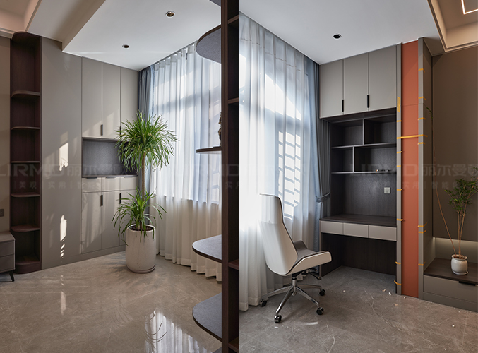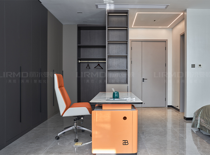 開放式書桌選用橙色椅子點綴,在視覺上體現了整個空間的層次感。