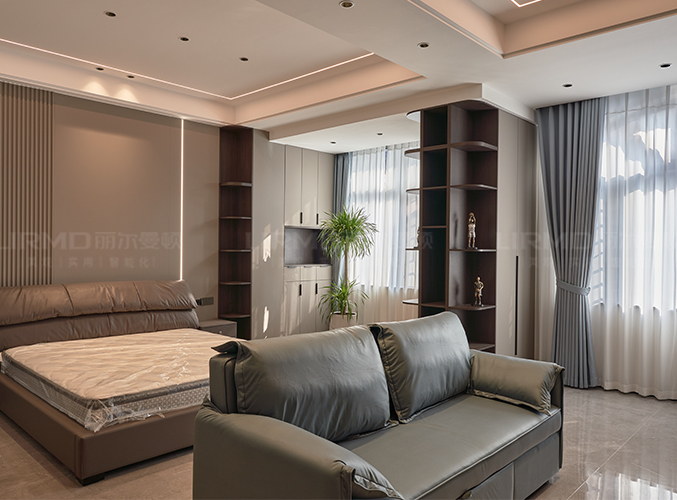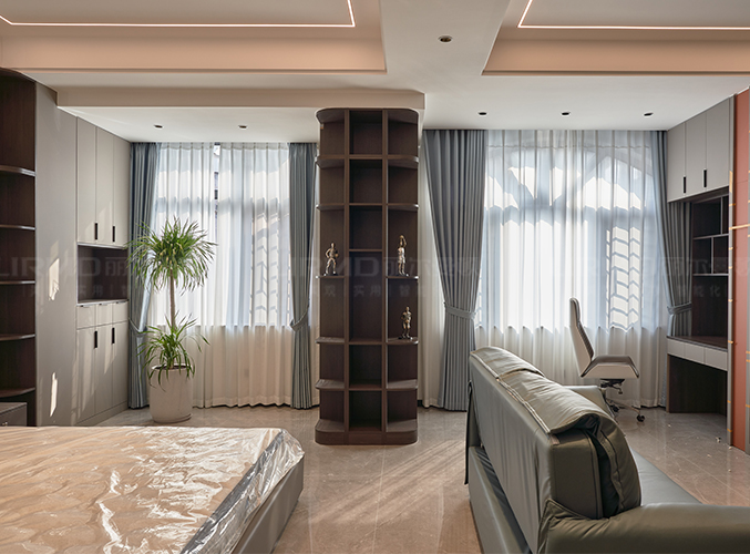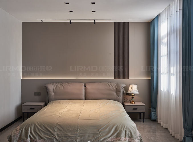 床頭背景墻選用膚感格柵,吊頂無主燈設計,