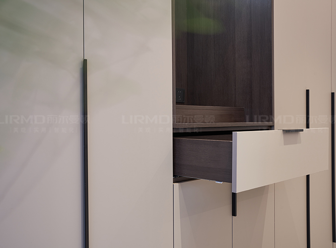柜門選用膚感PET一門到頂設計,搭配開放格+抽屜柜