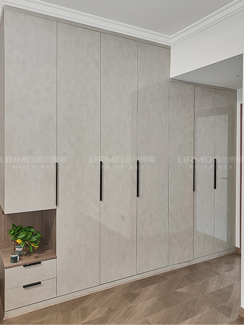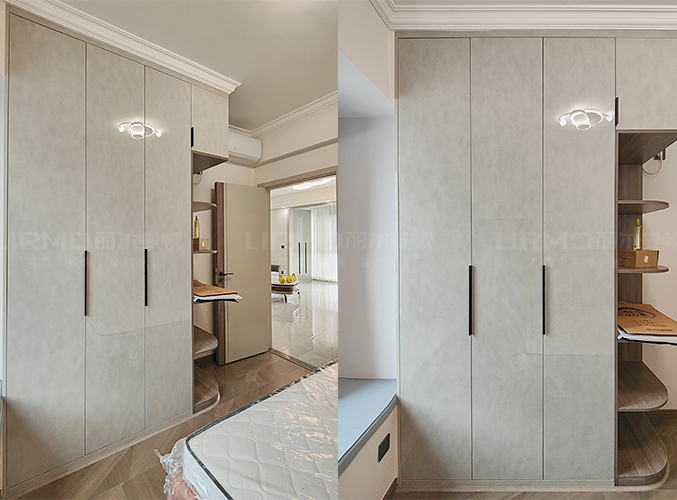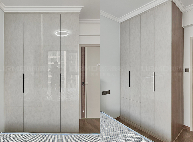 臥室選用一門到頂設計收納空間超大,右側加入分割式柜體擺放書物何一些其它物品,