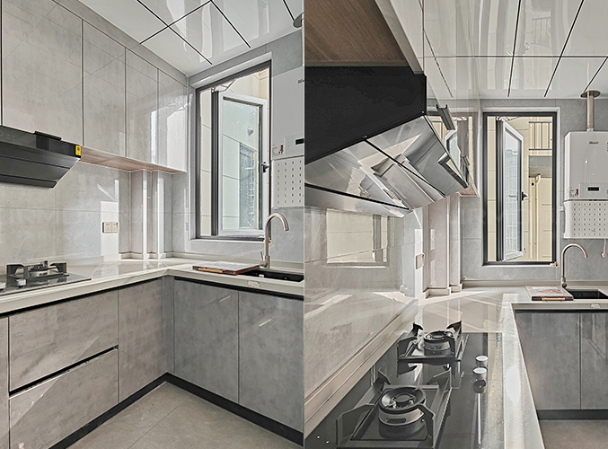 立面簡致,紋理細膩,增加了瓷磚防油漆,上方有餐柜,視覺層次更加豐富,