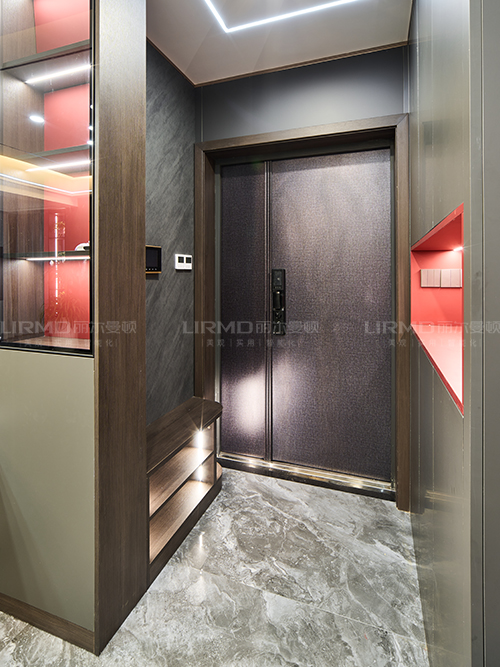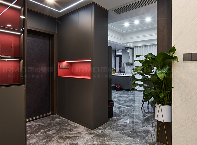 實木柜體搭配PET膚感柜門,收納更方便,左邊配有實木鞋架,深色柜門與紅色內嵌的碰撞,