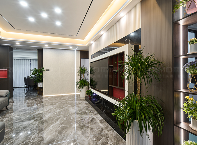整屋通鋪瓷磚,盡顯大氣,客廳無主燈設計,軌道燈+壁燈的組合,增強照明實用性的同時又增