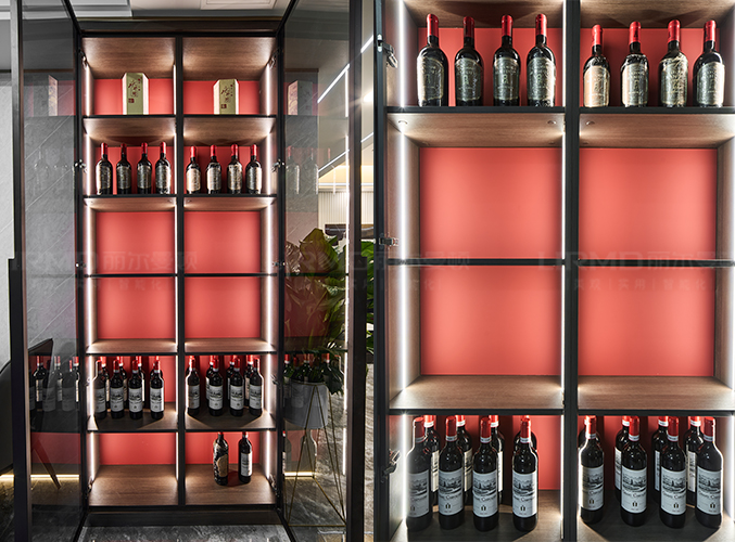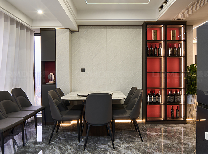 整體的墻柜很好的利用空間,收納大大的提升,擺放上酒或飾品,彰顯出主人的高級品味。