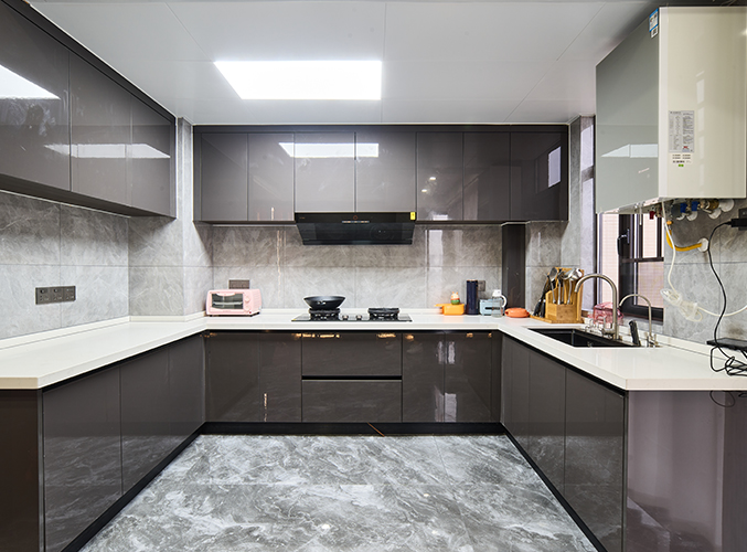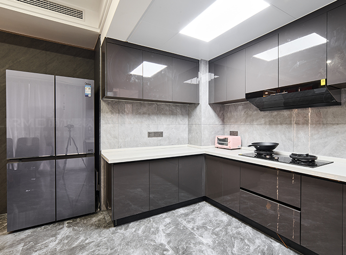 上下方都有收納柜,視覺層次更加豐富,搭配大理石臺面美觀又實用,左邊冰箱很好的利用空間,