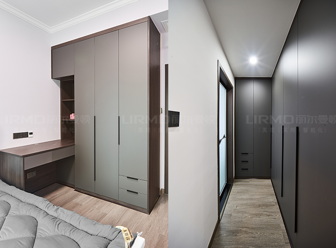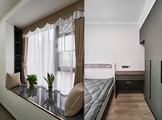 實木柜體搭配PET膚感柜門,衣柜+床頭柜的組合,收納更加方便,搭配上落地窗榻榻米的設計,
