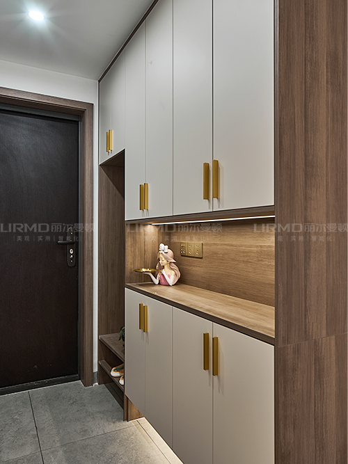 實木柜體搭配PET膚感柜門,收納更方便,左邊配有實木鞋架,鏤空處可