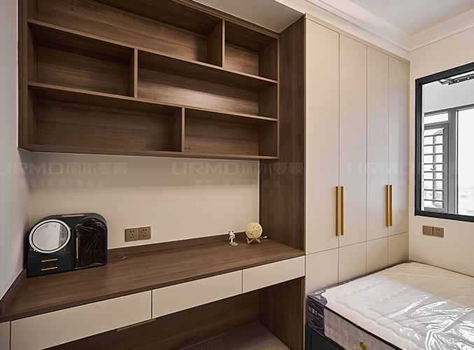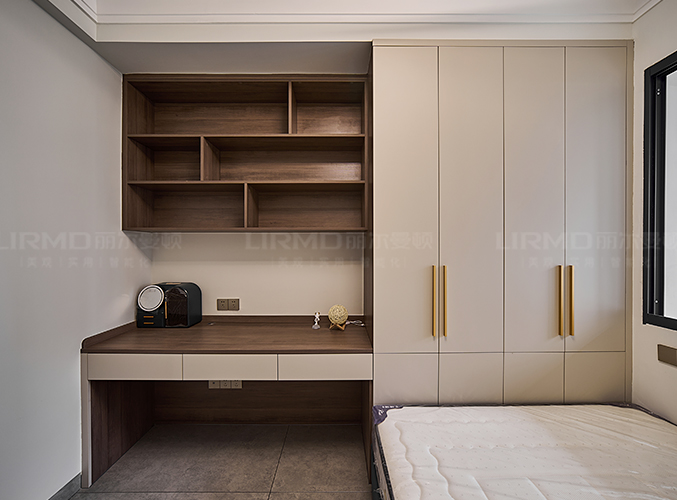 實木柜體搭配PET膚感柜門,衣柜+學習桌的組合,收納更加方便,走廊搭配一門到頂柜子,