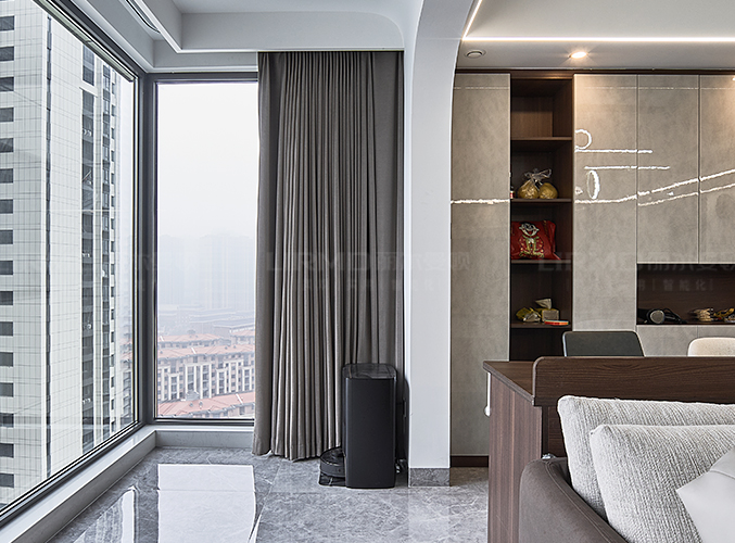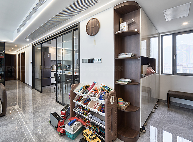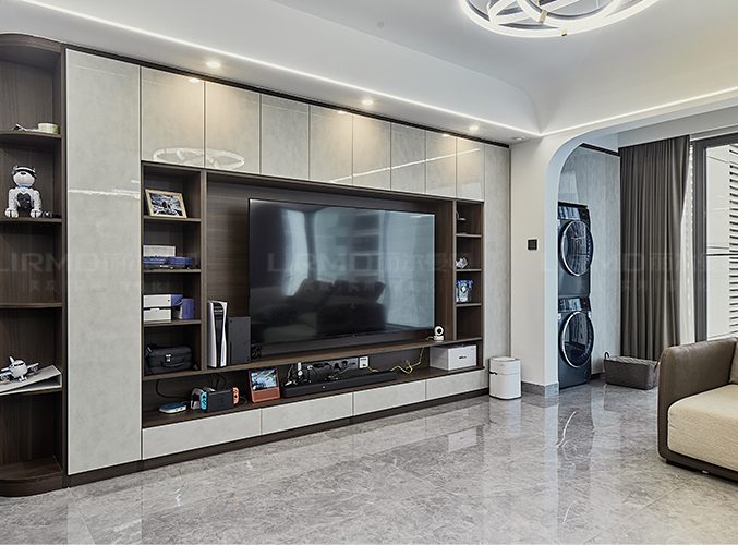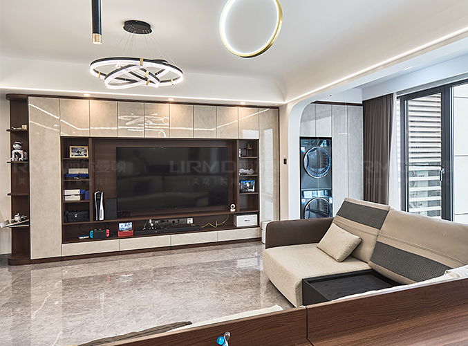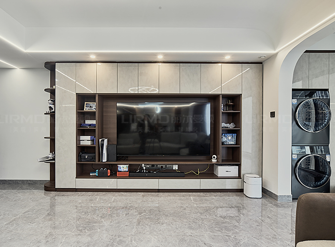 橫廳搭配全景落地窗,極簡(jiǎn)又顯高級(jí),電視背景墻采用整面墻做儲(chǔ)物柜設(shè)計(jì),整體效果不顯沉悶,