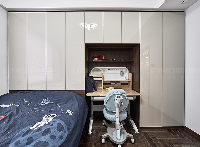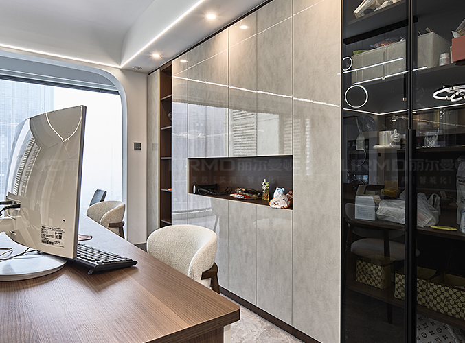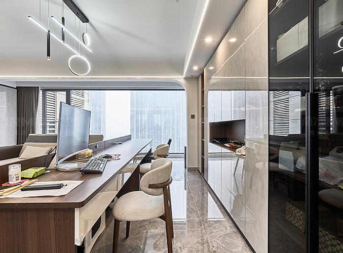 一整排儲(chǔ)物柜,玻璃柜門(mén)的設(shè)計(jì)削弱了柜體的厚重感,不顯沉悶,另一側(cè)做一整排的超長(zhǎng)書(shū)桌,