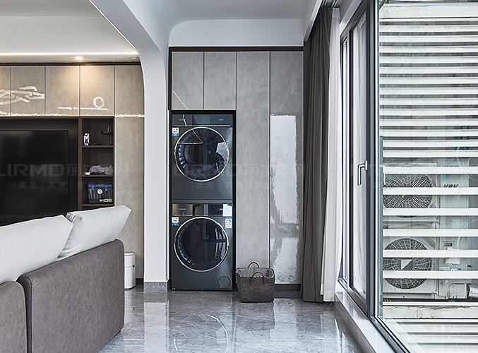 洗衣機(jī)一體柜,將洗衣機(jī)、烘干機(jī)疊放隱藏在柜體當(dāng)中,不顯突兀