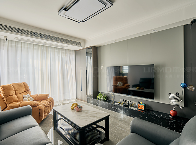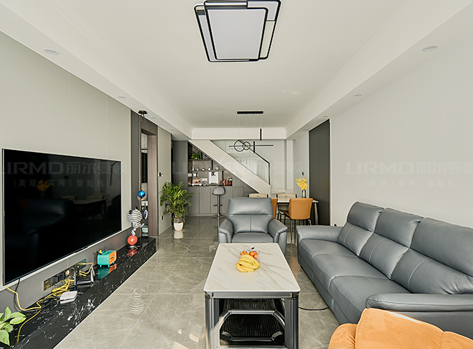 整屋通鋪瓷磚,盡顯大氣,電視背景墻采用整面墻設計,整體效果不顯沉悶,