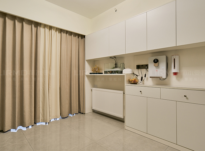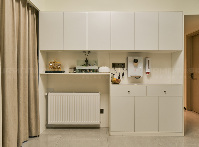 整體的墻柜很好的利用空間,收納大大的提升,整體白色與墻面統一,中空做飲水臺置物,