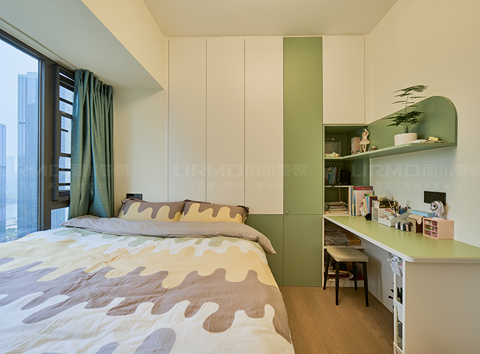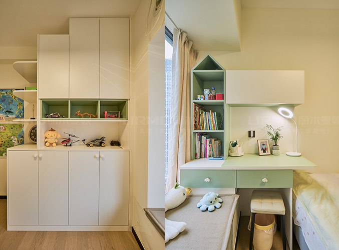 衣柜書桌一體化設計,學習辦公兩不誤,選用清新綠色+白色打造溫馨童趣空間。