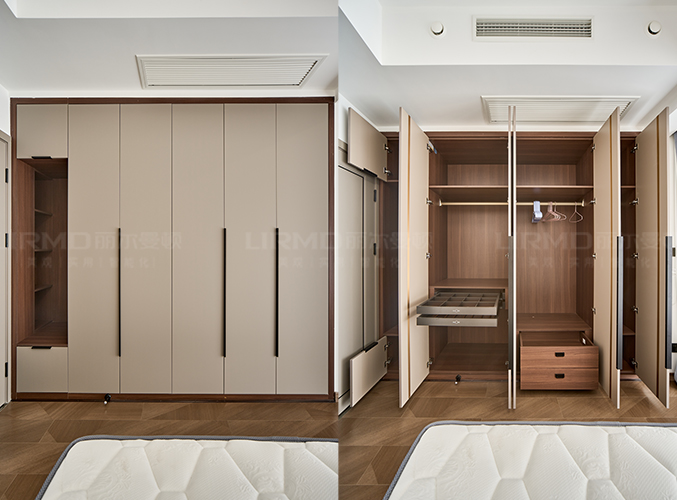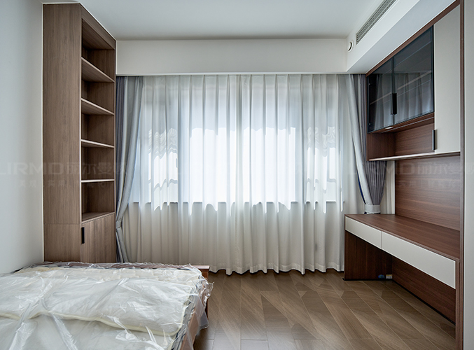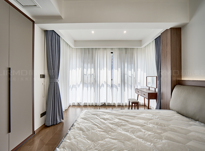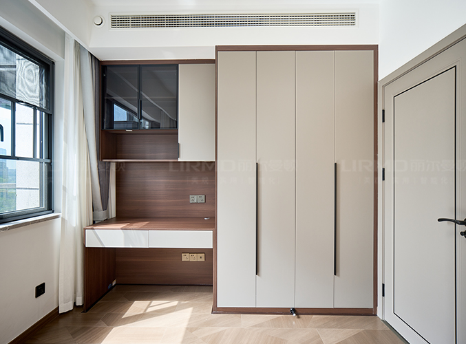 滿墻衣柜+同色系背景墻,超大陽臺放置梳妝臺采光一流,衣柜+書桌一體設計,儲物學習更方便。