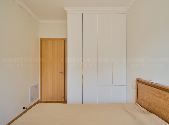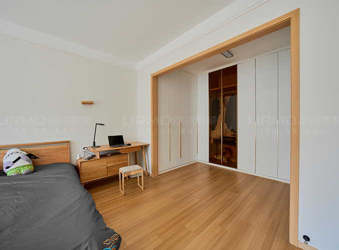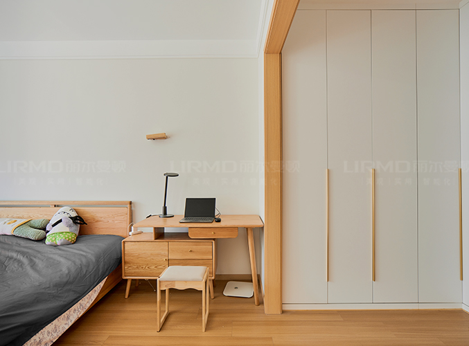 臥室整體原木+奶白,實(shí)木柜體搭配PET膚感柜門,一門到頂,質(zhì)感超不錯,
