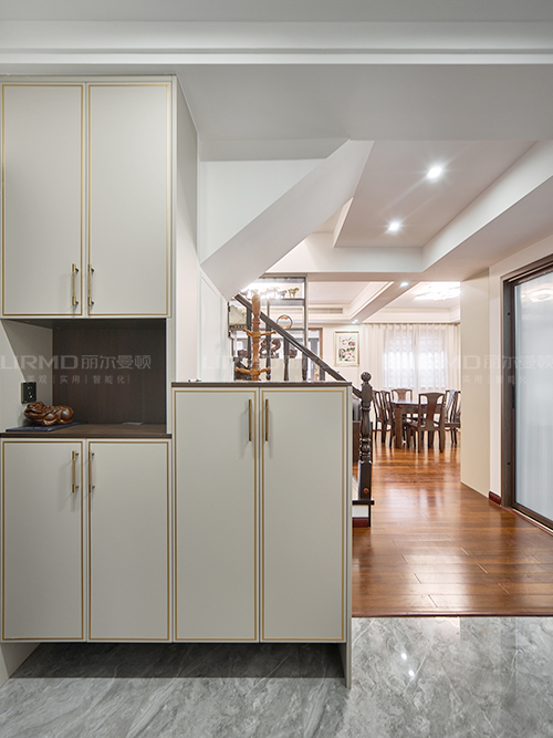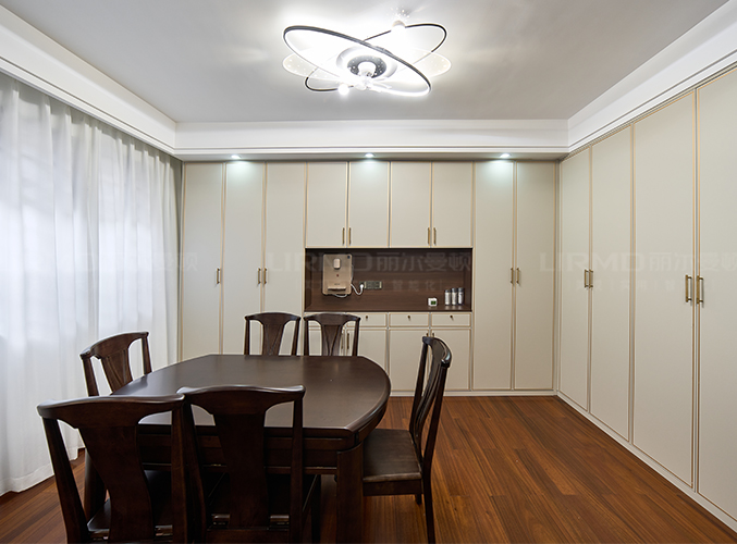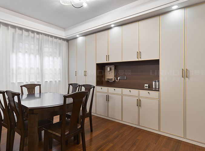 餐廳整墻做餐邊柜,白色柜門鑲嵌金屬邊框,分段造型柜門設計僅限優雅檔次。