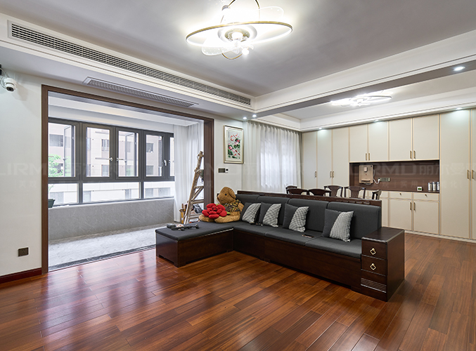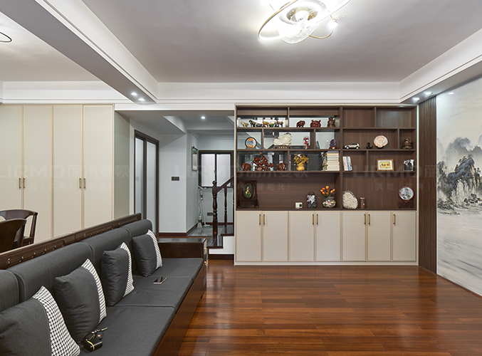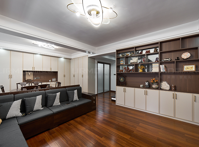 客廳鋪設木地板搭配山水畫電視墻,吊燈設計,增強照明實用性的同時又增貼了空間藝術感。