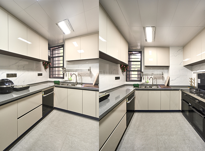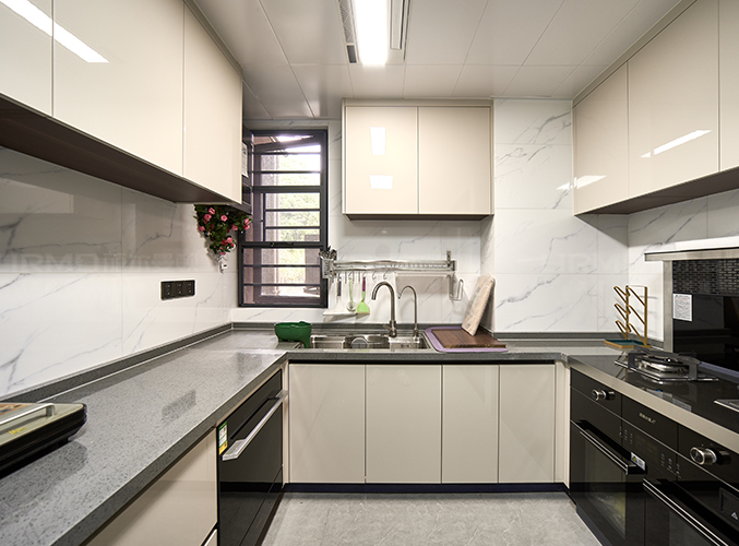 上下方都有收納柜,視覺層次更加豐富,搭配大理石臺面美觀又實用。