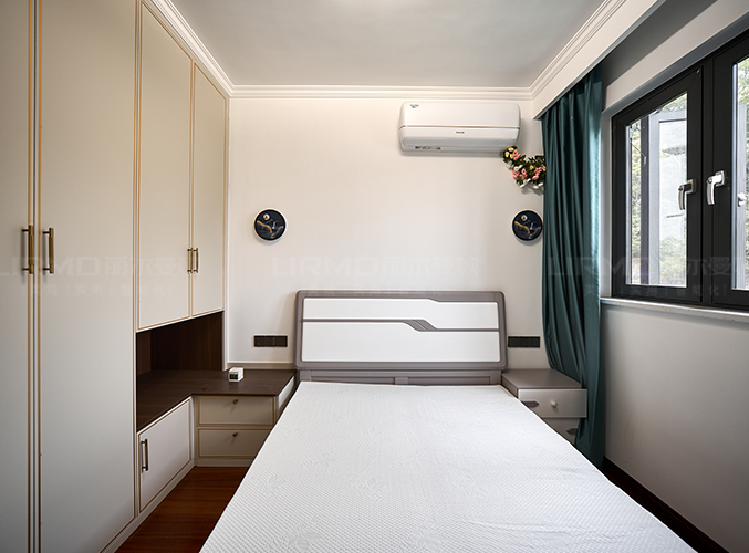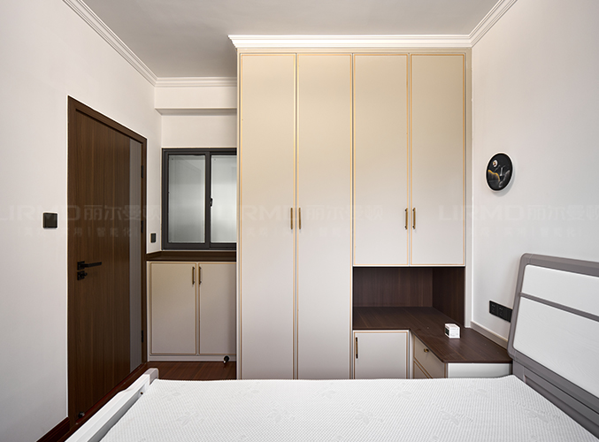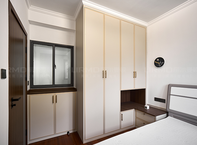 臥室同款造型衣柜,門墻柜一體化,衣柜開放格延伸做床頭柜,整體統一。