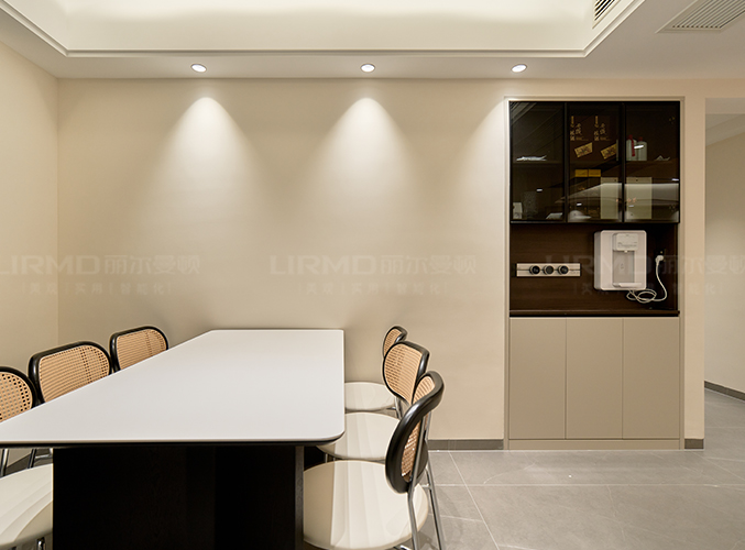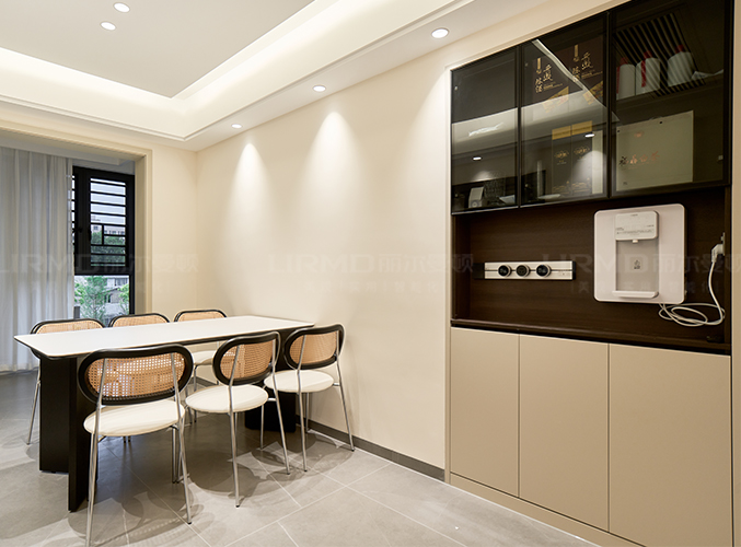 內(nèi)嵌餐邊柜,中間預(yù)留管線機(jī)位,,安裝移動插座,,方便電器使用,上方搭配玻璃柜門,