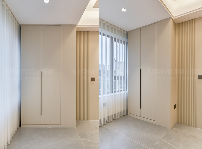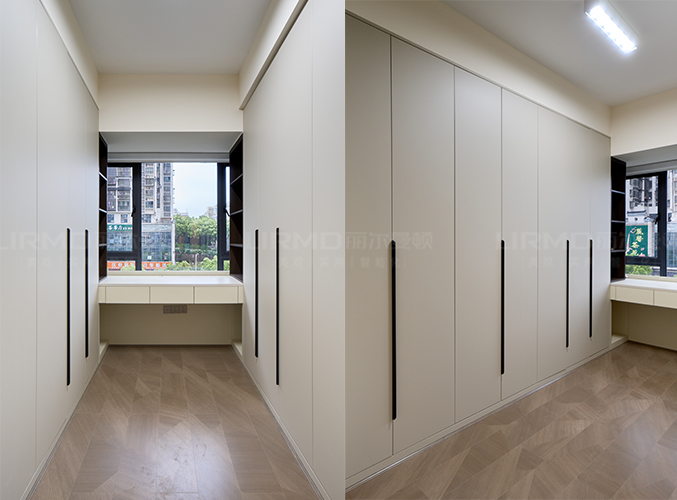 兩側(cè)做收納大衣柜,,靠窗位置可做書桌或梳妝臺的使用,旁邊兩側(cè)做開放格,