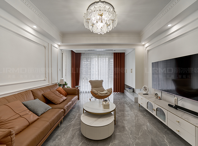 整屋通鋪瓷磚,盡顯大氣,整墻電視背景墻設計,下方搭配柜子,收納方便,吊燈設計,