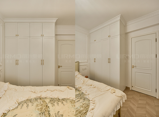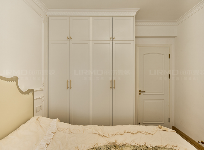臥室延續客廳風格以奶油色為基調,靠墻做整衣柜,實木柜體搭配PET膚感柜門,