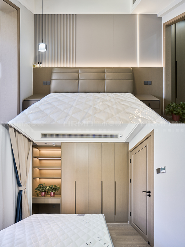 柜體采用足18厚杉木芯板,柜門采用LSB板PET膚感柜門,一門到頂,五金使用原裝進口的百隆五金