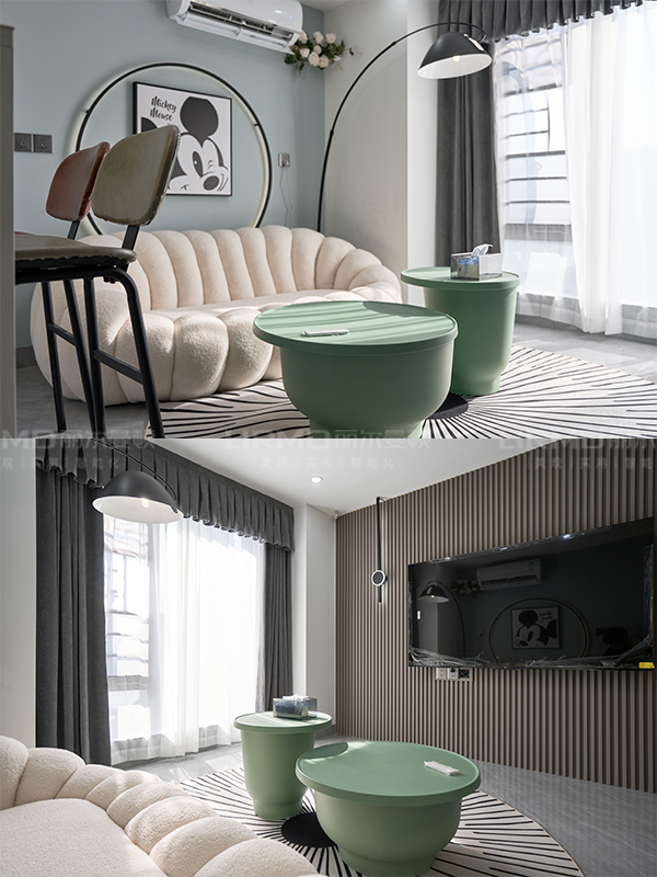 乳白色面包型沙發(fā)搭配湖藍(lán)色茶幾,時(shí)尚感upup