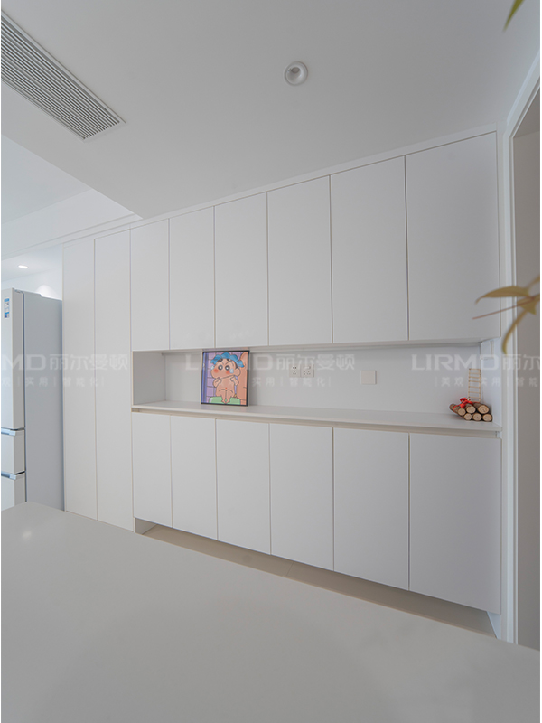 高端全屋定制:柜體板材為十環(huán)認證的萬象天冠18mm厚杉木芯板、柜門是歐松板雙飾面門、奧地利進口百隆五金。