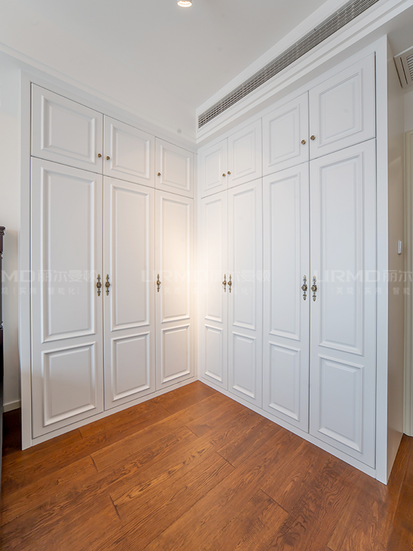 主臥帶L型獨立衣帽間,柜體柜門同色系配上銅色拉手點綴