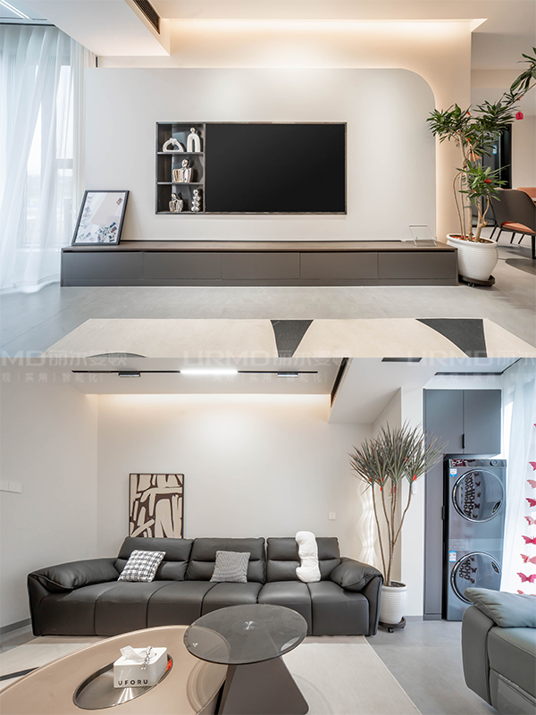 背景墻呼應(yīng)吊頂做懸浮造型,弧形設(shè)計(jì)讓整體看起來更大氣