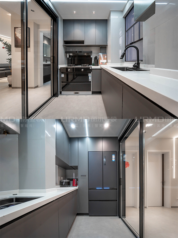 統(tǒng)一配置超高房門,L型櫥柜均采用5大系統(tǒng)定制,高低臺(tái)面滿足人體工程學(xué)設(shè)計(jì)