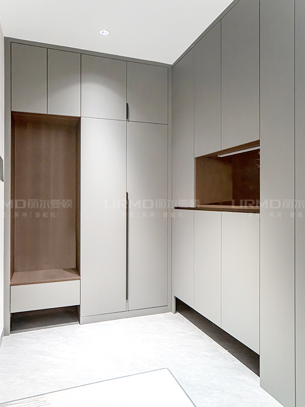L型轉角鞋柜,轉角位置與沙發背景墻做一體設計,搭配隱形門,空間整體性更強