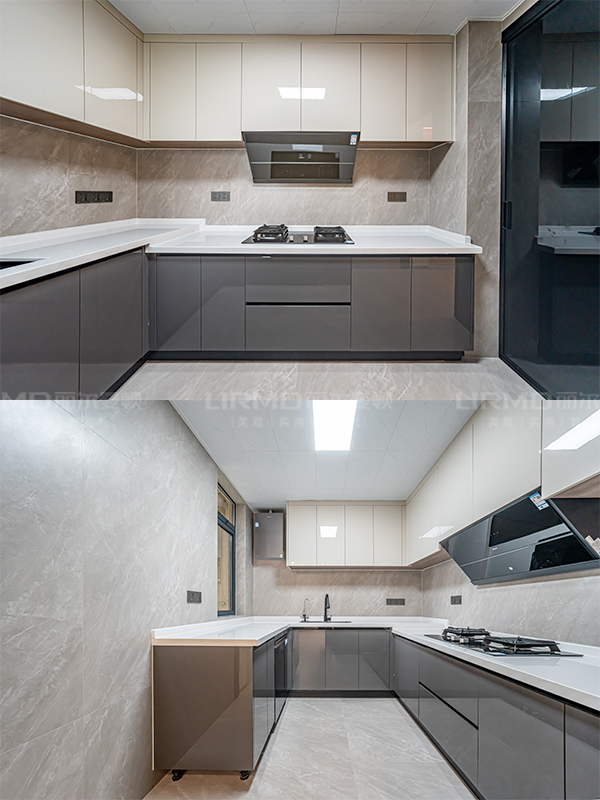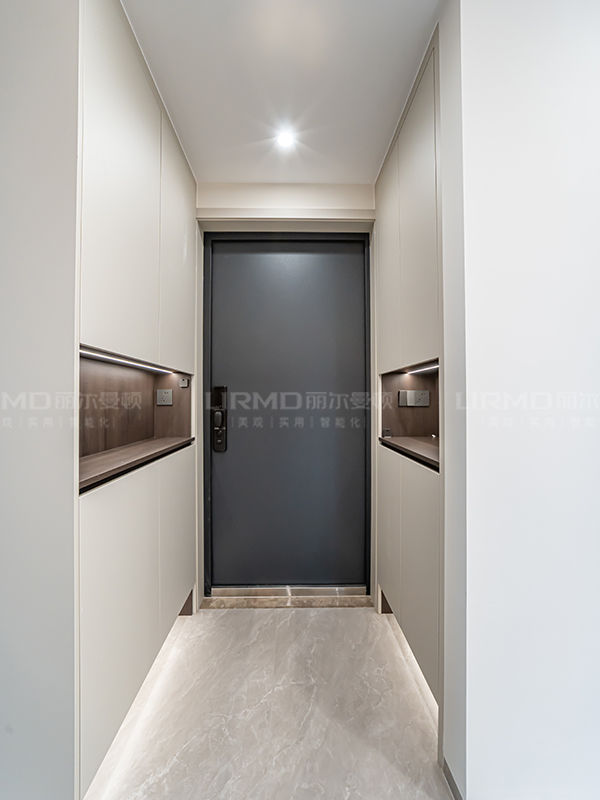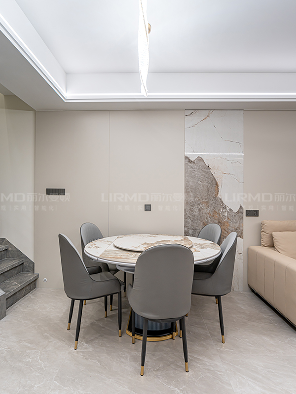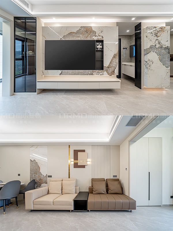 嵌入式轉(zhuǎn)墻冰箱柜、玄關疊級造型、潘多拉巖板上墻,電視背景墻以及整墻配套同色沙發(fā)背景