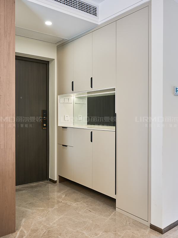 整體定制柜顏色選用濟(jì)州灰加象牙灰的撞色搭配,讓整體顏色更加自然清新