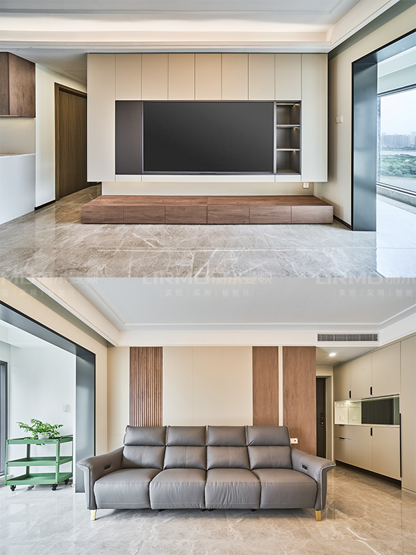 整層電視背景柜,下方中段鏤空搭配燈帶地臺(tái),舒適美觀