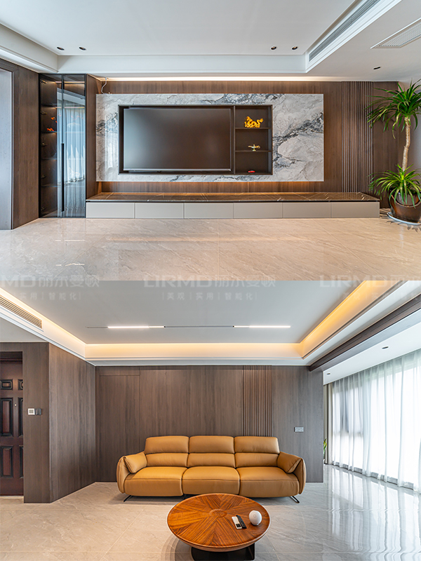 懸浮大理石電視柜與木質的溫暖搭配,營造出沉穩內斂之感