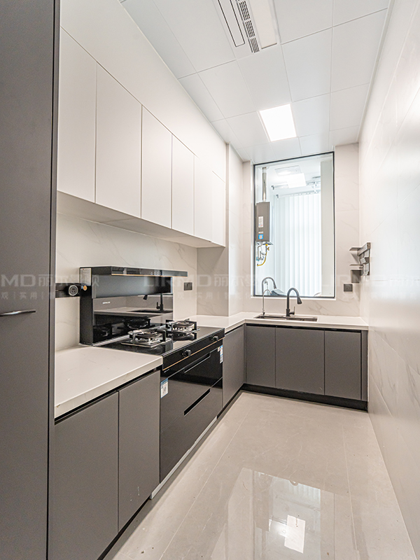 L 型櫥柜以白色和灰色為主色調(diào),簡(jiǎn)潔大方,易于清潔和維護(hù)