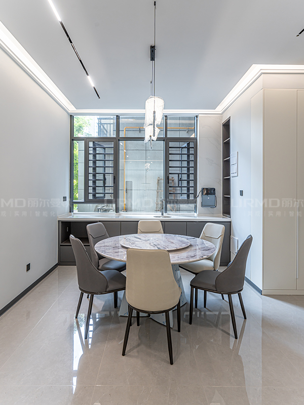 客廳以白色為主,采用開(kāi)放式布局,餐桌和餐椅線條流暢,色彩統(tǒng)一簡(jiǎn)約的線條空間感滿滿