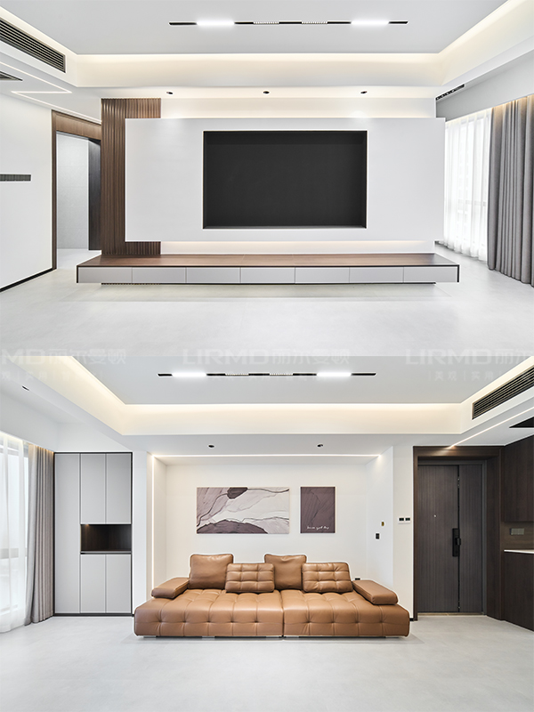 客廳收納柜做免拉手設(shè)計(jì),搭配隱藏式燈帶,視覺上更顯大氣