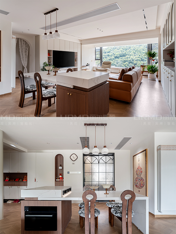 暖棕皮質沙發和魚骨木紋瓷磚地板顏色搭配,法式島臺嵌入蒸烤箱,空間利用超強。